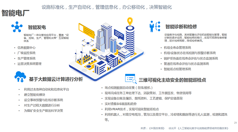 智能数字化电厂是电力工业逐步落实工业自动化(工业4.0),先进信息化技术(互联网+),两化融合带来的一种最新发展趋势,是给电站添加以智能运行、检修、管理、决策为核心的智能化大脑。如图所示: